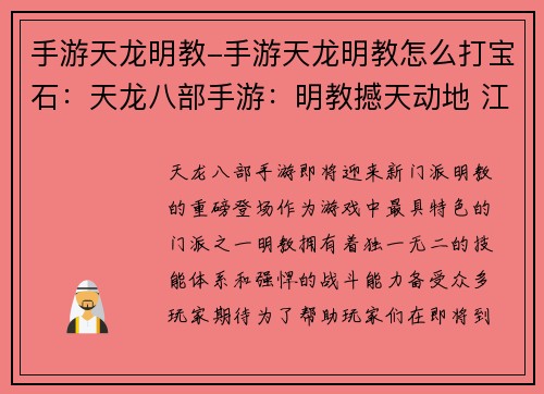 《天龙八部》手游即将迎来新门派——明教的重磅登场。作为游戏中最具特色的门派之一,明教拥有着独一无二的技能体系和强悍的战斗能力,备受众多玩家期待。为了帮助玩家们在即将到来的明教争霸中脱颖而出,笔者将在此对明教的宝石搭配进行详细解析。 明教宝石搭配思路 明教是一个近战输出门派,其技能伤害主要以火属性为主...