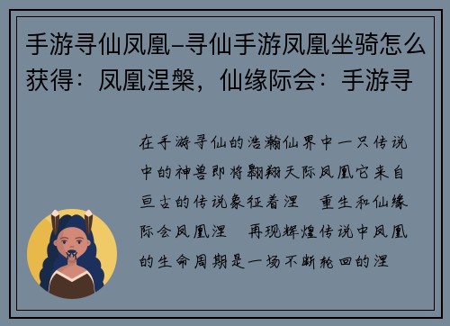 手游寻仙凤凰-寻仙手游凤凰坐骑怎么获得:凤凰涅槃,仙缘际会:手游寻仙的全新历程